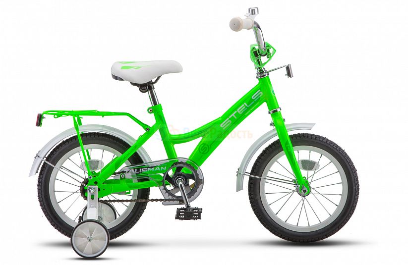 Велосипед Stels Talisman 14 Z010 для детей от 3 до 5 лет. Стальная рама и жёсткая стальная вилка. Съёмные боковые колёсики помогут в обучении катанию. Высокий руль и эргономичное сиденье обеспечивают комфортную посадку. Руль регулируется как по высоте, так и по углу наклона. Задний ножной тормоз. Полная защита цепи, мягкие накладки на руле, клаксон - всё это сделано для безопасного катания Вашего ребёнка. В комплект велосипеда входят: стальные крылья, багажник и звонок.